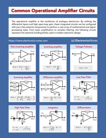 In this infographic, I've summarised some of the more popular operational amplifier circuits along with the relevant design formulas.